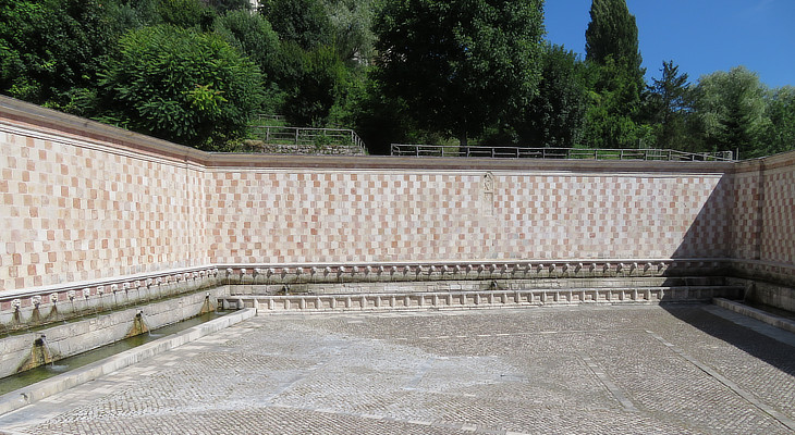 Initially the fountain had 15 spouts. In 1294 at the time of the coronation of Pope Celestine V at S. Maria di Collemaggio the wall was decorated with red and white stones. By the end of the XVth century 19 other spouts had been added. Margaret of Austria, who ruled over Abruzzo in 1571-1584, commissioned the construction of the lateral sides which turned the fountain into a piazza and 59 spouts were added. Margaret had a fiefdom (Castelmadama) near Tivoli and was aware of the fountains which were built there by Cardinal Ippolito d'Este.