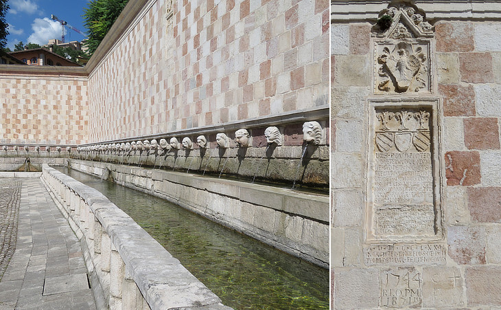 Fontana delle 99 Cannelle: (left) central section, the oldest one; (right) 1494 coat of arms of L'Aquila above an inscription decorated with the Angevin fleur-de-lis and stating that the fountain was built in 1272