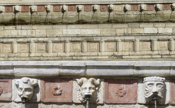 The fountain was named as if it had 99 spouts, but the last six ones were added in 1871. Since antiquity heads of lions were the most usual decoration of spouts (e.g. at Paestum and Baalbek), but in this fountain they are mixed with human heads and fantastical animals.