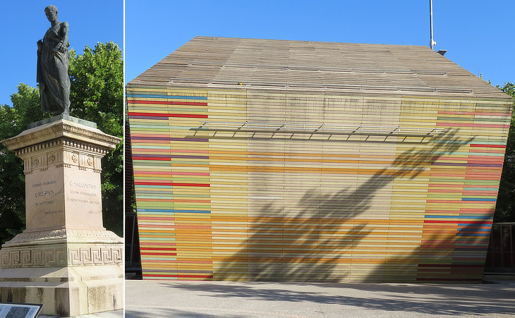 (left) 1903 Monument to Sallust, a Roman historian who was born at Amiternum near L'Aquila, by Cesare Zocchi; (right) Temporary Auditorium designed by Renzo Piano in 2012