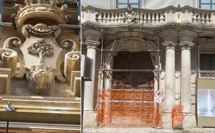 July 2023: (left) coat of arms at Palazzo Persichetti in the Belvedere neighbourhood; (right) portal of Palazzo Centi Colella opposite S. Giusta