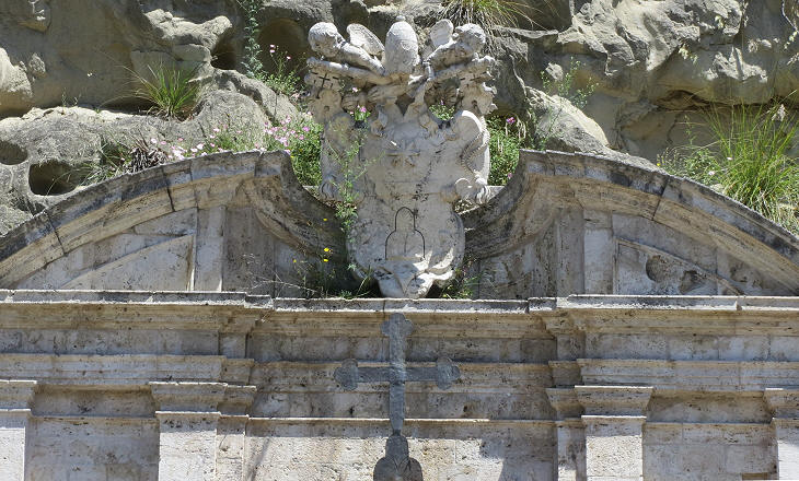 Detail of the church showing the coat of arms of Pope Clement XI
