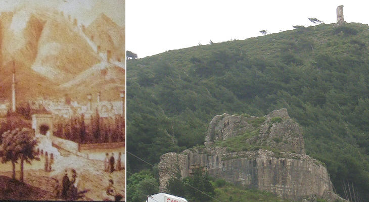 (left) Antioch fortifications in a XIXth century print; (right) a remaining tower near the city and another one on the top of the mountain