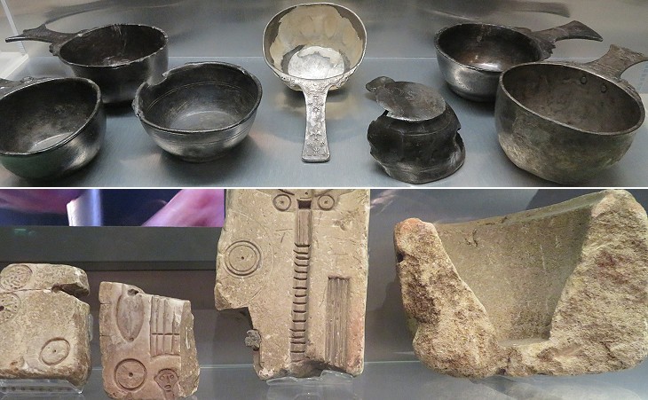 Roman Baths Museum: (above) pewter and silver wares; (below) pewter moulds