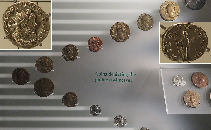 Roman Baths Museum: coins from the Beau Street Hoard; (insets) coin of Emperor Postumus (emperor in Gaul and Britain in 259-274) and reverse of a coin depicting "Fides Militum" (Loyalty of the Soldiers)