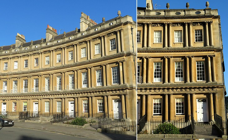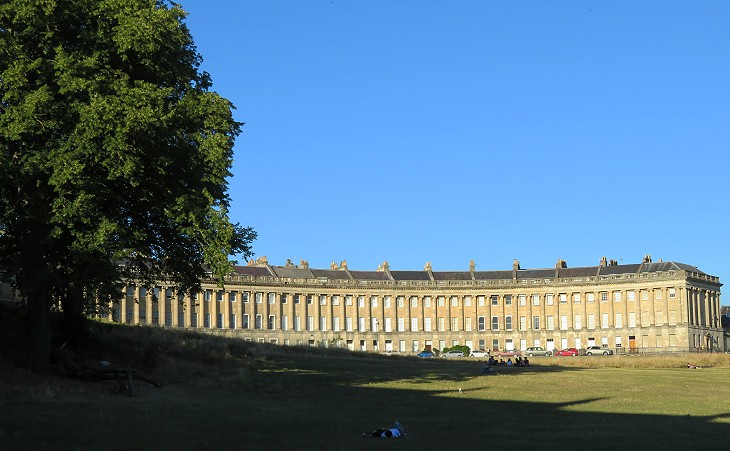 The Royal Crescent, a complex of townhouses forming a crescent. It was built in 1767-1774 by John Wood the Younger; the design of the interior of the townhouses was left to the buyers, thus the rear side is not uniform