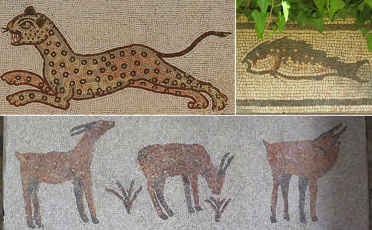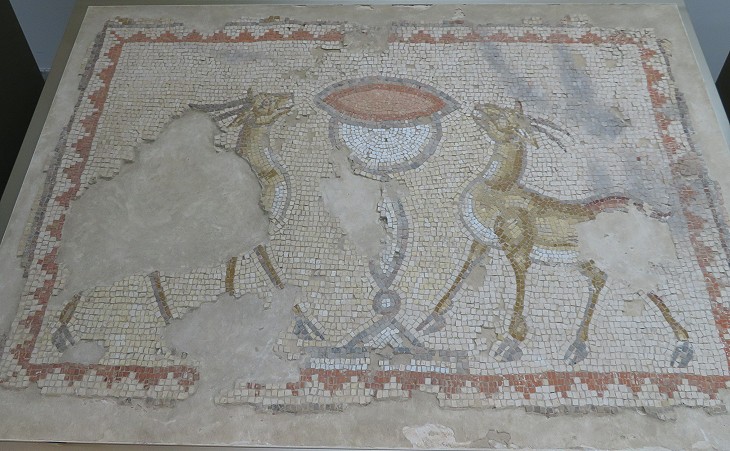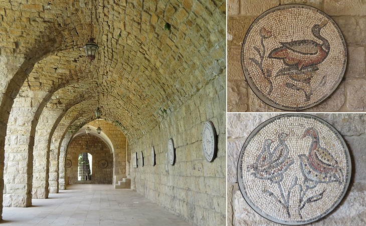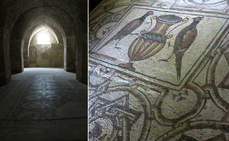 Beiteddine Palace: (left) mosaics on the floor of the former stables; (right) detail of one of them which depicts a typical Christian subject