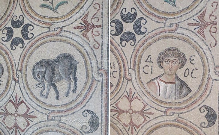 The conquest of Syria and Lebanon by Alexander the Great and the establishment of the Seleucid Empire in these countries in the late IVth century BC brought about the adoption of the solilunar Macedonian calendar. After the Roman conquest the solar Julian calendar was introduced, but because Greek was the prevailing language the months maintained their Macedonian names, so Daisios (Desios in this mosaic) corresponded to Roman Maius (May). Wild animals and personifications of seasons and months had always been popular subjects for large floor mosaics and the tradition continued in Christian churches e.g. at Kissufim near Gaza and at Aquileia.