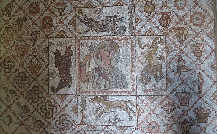 Not all the floor mosaics at Beiteddine are clearly related to a church, but their style dates them Vth or VIth century when Lebanon was entirely Christian. Ktisis is an allegoric figure symbolizing foundation and not a Greek goddess. In this mosaic she was portrayed in a rather iconic way, in line with the general tendency to move away from traditional Roman realism. More lively depictions of Ktisis can be seen in mosaics at the House of Eustolius at Kourion on Cyprus and at Antioch.