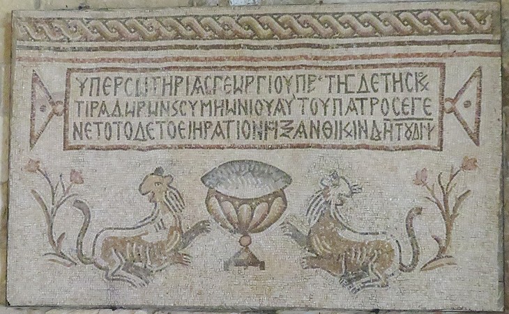 Some inscriptions on the floor mosaics helped archaeologists in dating them and in learning the old names of the locations where they were found and of some of their priests. This mosaic contains a dedication to George, priest of the village of Tiadora, in the year 714 of the calendar of Tyre which corresponds to the year 589. Its poor execution could reflect the economic decline of Lebanon after the 551 Beirut Earthquake which not only destroyed that city, but caused great damage to all the coastal towns. The town of Madaba in Jordan retains the floor mosaics of many early churches, including some which were made after 551 and, at nearby Umm ar-Rasas, some which were made even after the Muslim conquest.