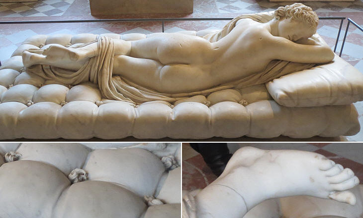 Louvre Museum: (above) Sleeping Hermaphroditus, the womanish son of Hermes and Aphrodite; (below) details by Bernini (1620)