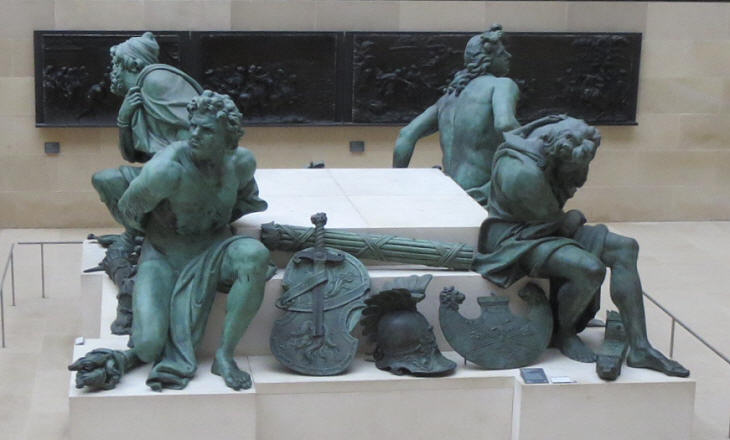 When eventually King Louis XIV agreed to have a large statue of himself placed in a square in Paris, he was portrayed standing on a high pedestal with a winged Victory placing a crown on his head. The statue of the King was destroyed during the French Revolution; the lower part of the monument portraying four conquered nations escaped destruction and it is now at the Louvre Museum. There was perhaps an excess of flattery in portraying Spain, the Austrian Empire, the Dutch Republic and Brandenburg-Prussia in chains.