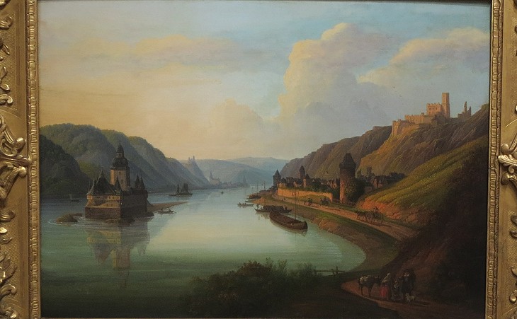 Mittelrhein Museum of Koblenz: Pfalzgrafenstein (left, on an islet) and Gutenfels (right, on the hill) Castles in a XIXth century painting (and as they are today in the introductory page)