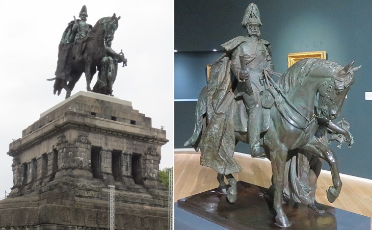 (left) Deutsches Eck: Monument to Emperor William I (it brings to mind that to King Victor Emmanuel II in Rome); (right) small scale copy of the statue at the Mittelrhein Museum of Koblenz