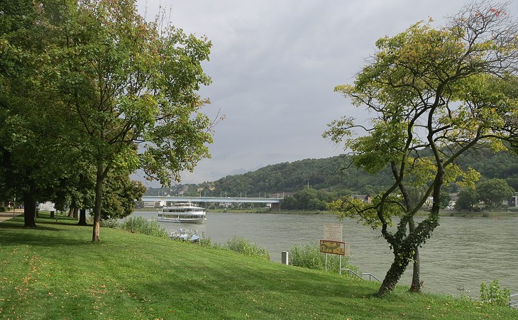Travel accounts and guidebooks usually described the Rhine Gorge in a southbound direction. This page shows sites between Mainz and Koblenz which were seen from a cruise boat in a northbound direction.