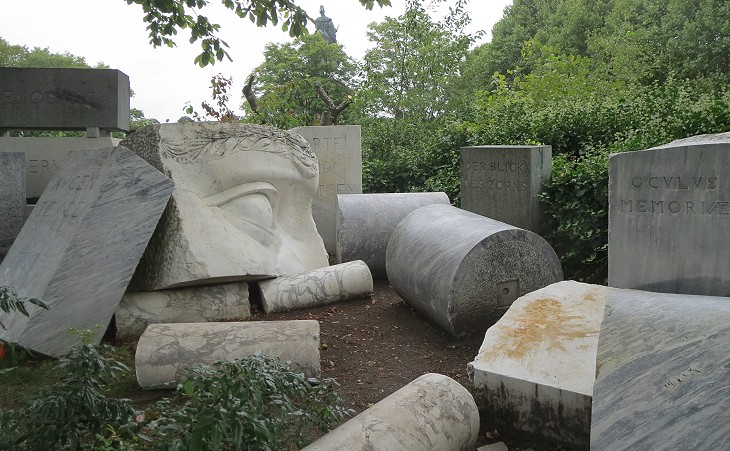The monument was destroyed in 1945. In 1993 a copy of the statue was placed on the restored pedestal as a symbol of German unity after the 1989 events. Almost at the same time, perhaps to balance the nationalistic rhetoric of the monument, an installation conveying the feeling of the passing of time was placed behind it.