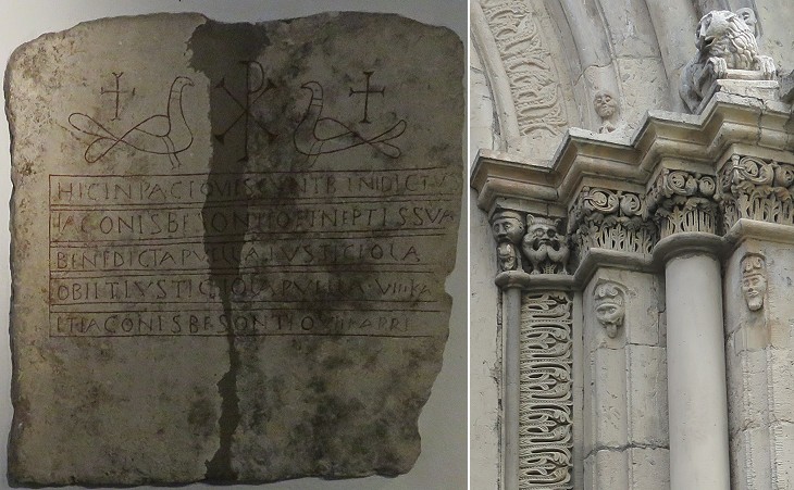 St. Severus': (left) early VIth century gravestone of Besontio and Justiciola; (right) detail of the portal