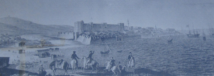 white marble, which are about two feet and a half in diameter. (..) The castle is a large high building, on a little rocky cape between the two ports. Pococke