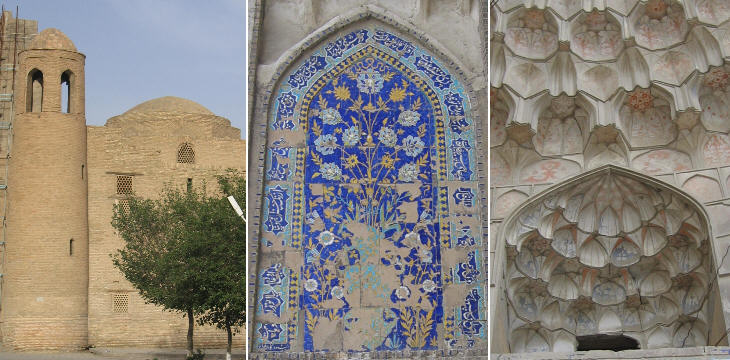 Abdoul Aziz Khan Medrese (XVIIth century): (left) side view; (centre) tile mosaic representing a vase with flowers, see a similar one at Yazd in Persia; (right) muqarnas of the central niche