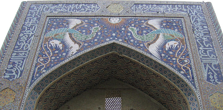 The decoration of the portal is characterized by two simourghs (phoenix birds) holding a white deer. This violation of the Muslim iconographic rules preceded that which a few years later appeared on the portal of Chin Dor Medrese in Samarkand's Registan.