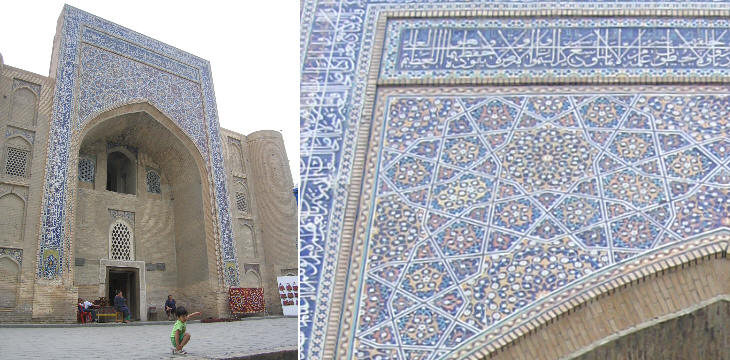 Mir-i-Arab Medrese: (left) mosaic portraying a vase with flowers; (right) door
