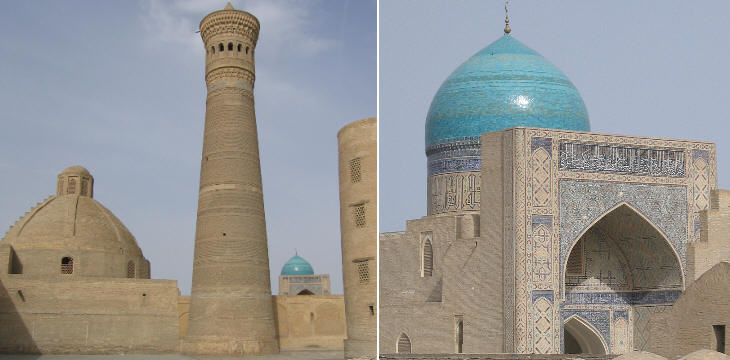(left) Alim Khan Medrese (XXth century) and Kalon Minaret; (right) Kalon Mosque: dome