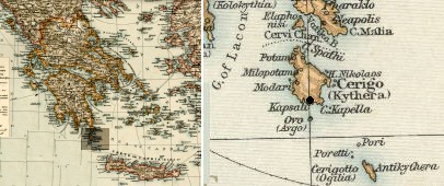 Cerigo is located between the Peloponnese and Crete. Together with the island of Cerigotto (Antikythira) it allowed