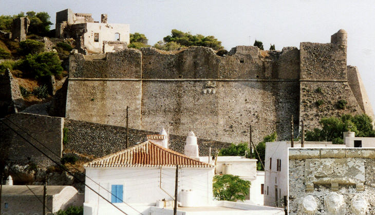 The fortress and the walls protecting the town of Cerigo; (inset) a tower