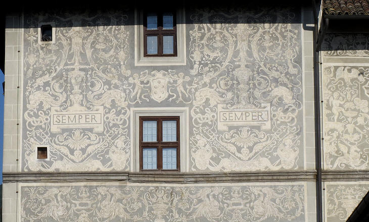 When the decoration was being made Alessandro Vitelli was under the service of the Medici and his palace was decorated with their coat of arms and the motto "semper" (always) which alludes to the perpetuity of the Medici dynasty. The vases holding three crescents in the lower part of the image were probably added after Alessandro Vitelli fought against the Ottomans in Hungary (you can see them better in the image used as background for this page).
