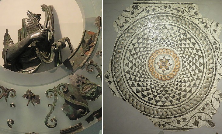 Museo Archeologico di Cividale: (left) detail of a bronze "clipeus" (a round shield and eventually a decorative frame for portraits and busts) most likely portraying a member of the Julio-Claudian family found at "Iulium Carnicum" north of Cividale; (right) Ist century AD mosaic found at Cividale with an optical pattern which can be seen in many parts of the Roman Empire, e.g. in Tunisia