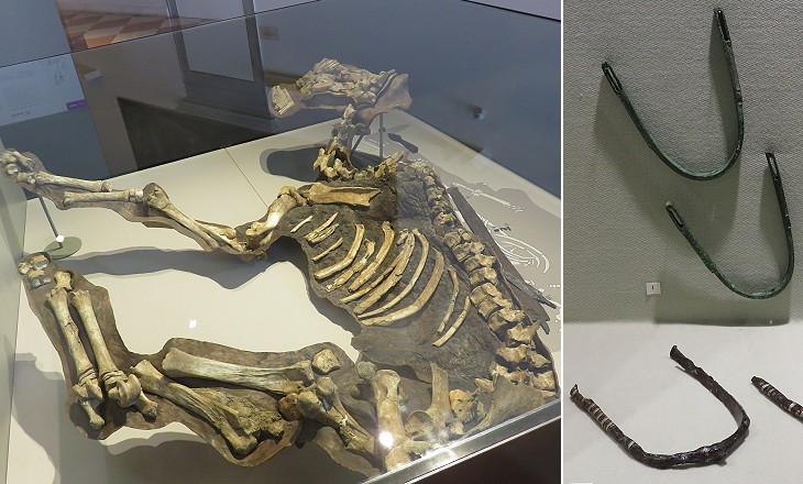 Museo Archeologico di Cividale: (left) skeleton of a horse which was buried with its Longobard master; (right) Longobard spurs