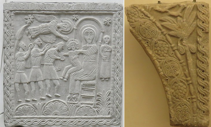 (left) Altar of Ratchis (Museo Diocesano); (right) fragment from a tegurium (a small canopy) (Museo Archeologico)