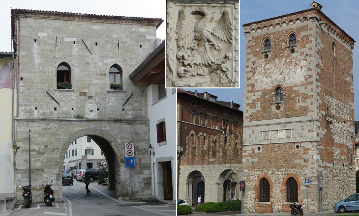 (left) Cividale: Porta S. Pietro; (right) Udine: Porta Aquileia (XVth century); (inset) coat of arms of the Patriarchs of Aquileia at Udine. The image used as background for this page shows another coat of arms of the Patriarchs at Cividale