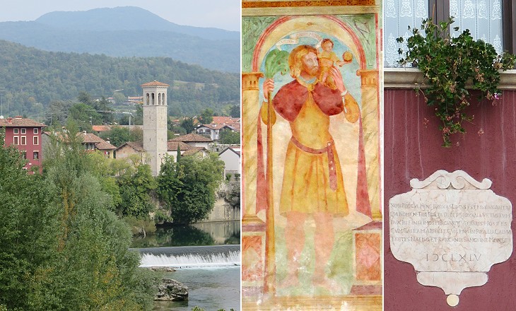 (left) SS. Pietro e Biagio; (centre) detail of its XVIth century painted façade showing St. Cristopher; (right) inscription recalling a victory over the Sclaveni (Slavs) in 664 on the wall of a nearby building