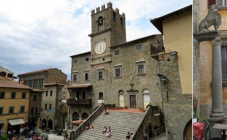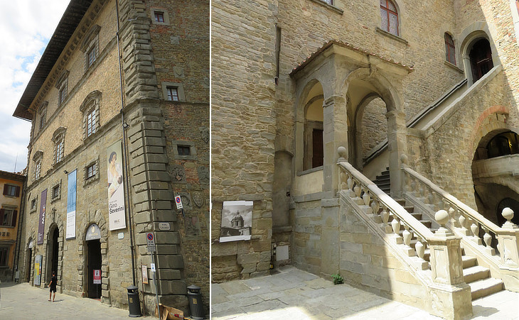 Palazzo Casali or Pretorio: (left) façade; (right) courtyard with two staircases: the larger leads to MAEC (Museo dell'Accademia Etrusca e della città di Cortona), and the smaller to the Library and offices of Accademia Etrusca