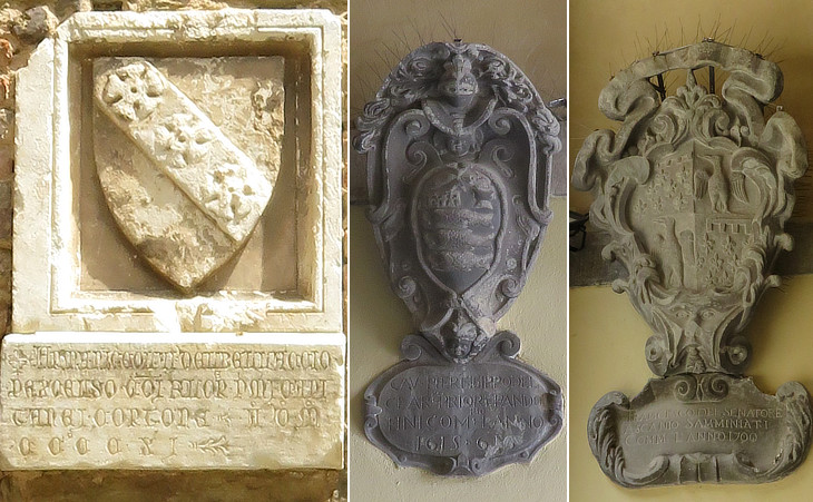 Palazzo Casali or Pretorio - coats of arms: (left) Niccolò Bellaccio, the first Florentine Capitano del Popolo; (centre) Filippo di Priore Pandolfini (1615); (right) Ascanio Samminiati (1700)