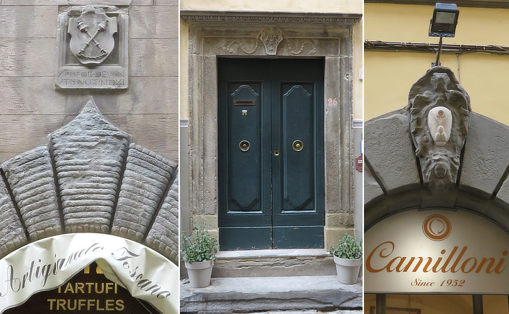 Details of palaces of noble families in Via Nazionale, that on the left bears the 1511 coat of arms of Cristoforo Venuti; a member of this family was among the founders of Accademia Etrusca in 1726