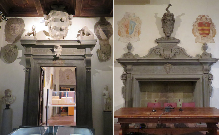 Palazzo Casali or Pretorio: interior: (left) entrance to one of the main halls with a grand coat of arms of the Medici between two small lions; (right) 1636 mantelpiece