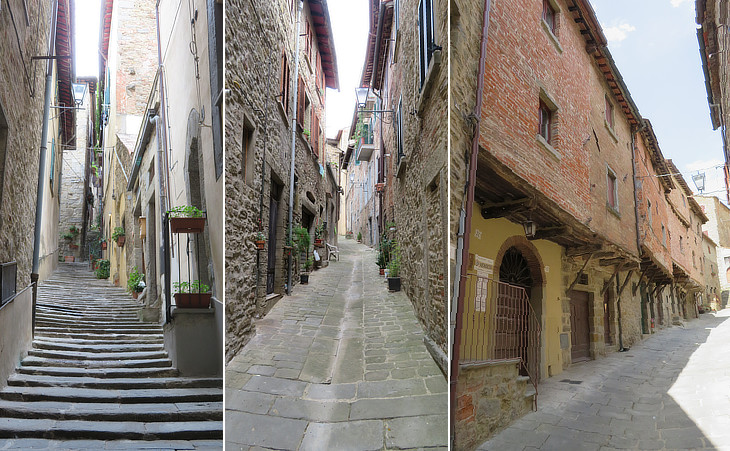 Uphill streets of Cortona; the last image shows some small houses in Vicolo Iannelli which retain their medieval timber supporting structures