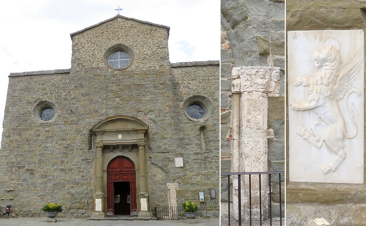 Cathedral: (left) façade (one of the first things a traveller from Rome notices in Tuscany is that the façades of many churches were never completed); (centre) pillar of the medieval church; (right) Winged Lion of St. Mark, symbol of Cortona (and of Venice), relief at the side of the entrance; another relief portraying St. Michael the Archangel is shown in the image used as background for this page