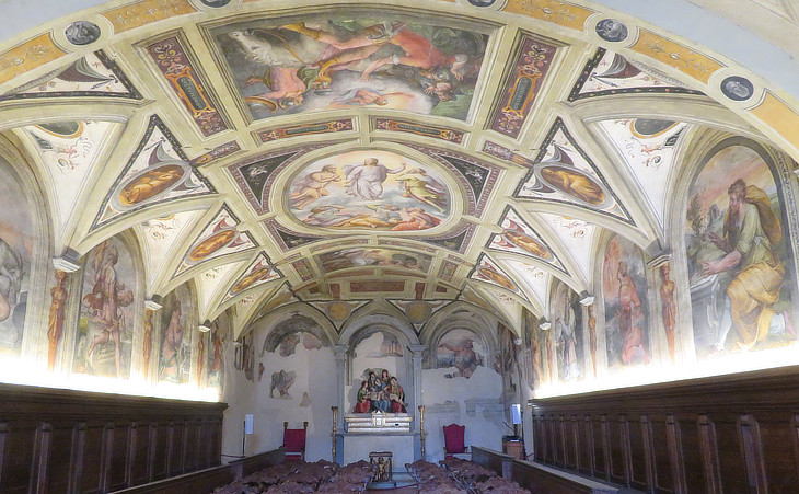 Giorgio Vasari (1511-1574) was born at Arezzo and he became the court architect of Grand Duke Cosimo I de' Medici. In this capacity he was involved in the design of many buildings in Florence and other towns of Tuscany. In addition to being an architect and an art historian he was also a painter with a very busy workshop. In 1554 he was asked to advise on the decoration of an underground oratory in the Jesuit church of Cortona; the frescoes were executed by his pupil Cristoforo Gherardi. The two artists were involved also in the decoration of Palazzo della Cannoniera at Città di Castello.