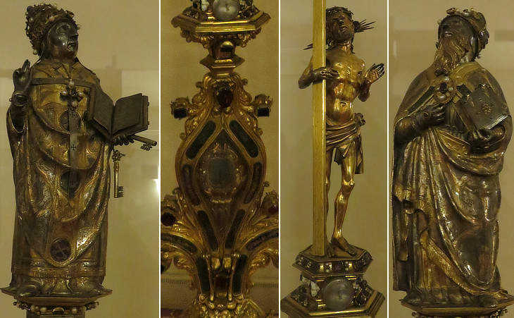 Museo Diocesano - Reliquiario Vannucci (1458) - from the Cathedral: (left) Pope Nicholas V; (centre) a) section containing a fragment of a portrait of Christ on a cloth; b) Jesus carrying the Cross; (right) Gregory III, Patriarch of Constantinople in 1443-1451 (he is regarded as a saint by the Catholic Church)