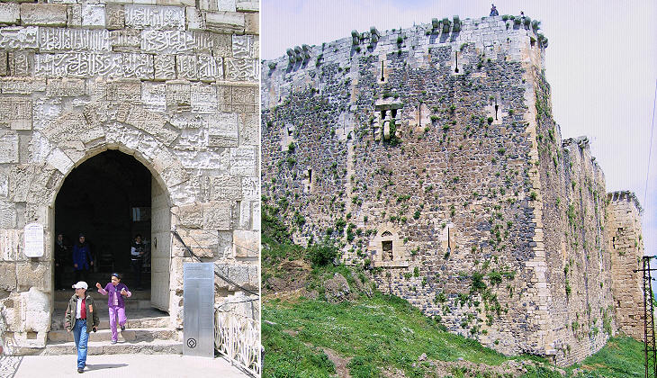 (left) Entrance with a long inscription by Baibars celebrating his seizure of the castle; (right) south-western corner of the outer walls (Baibars built large baths in the tower to the far right)