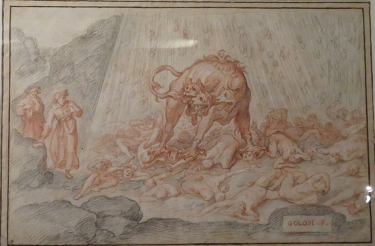 Dante, Virgil and Cerberus in the Circle of the Gluttonous (Inferno - Canto VI) - Engraving by Federico Zuccari 1586-1588; you may wish to see some frescoes depicting episodes of Dante's poem at Villa Massimo.