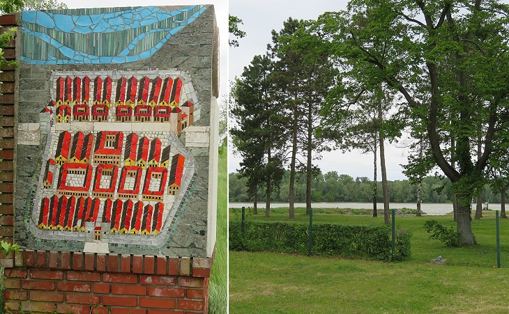(left) Assumed layout of the Roman military town of Carnuntum at Altenburg in Austria, near the border with Slovakia; (right) the River Danube at Altenburg
