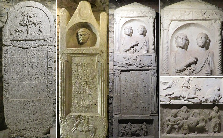 Fabricius House at Sopron (Roman Scarbantia) in Hungary: tombstones: (left) a veteran of Legio XV Apollinaris; (centre) a veteran of Ala I Gemelliana; (right) a veteran of Ala Scub(olorum) with his daughter and details of the tombstone showing a cavalryman and the fight between Eteocles and Polynices, the two sons of Oedipus who killed each other