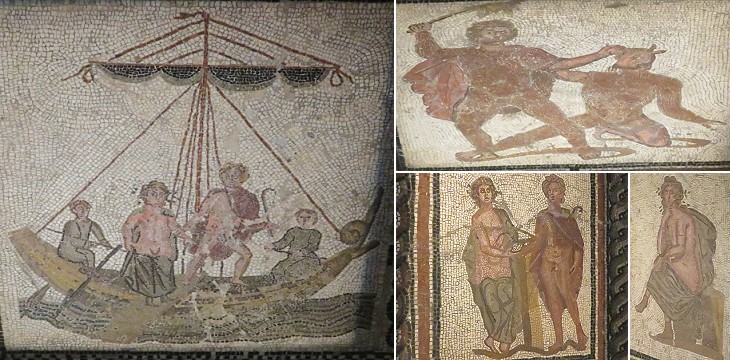 Kunsthistorisches Museum: details of the Loig floor mosaic depicting Theseus and Ariadne on a ship leaving Crete, the killing of the Minotaur, Ariadne giving the ball of thread to Theseus and Ariadne at Naxos