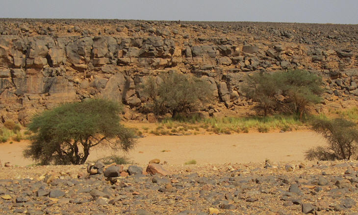 Uadi Mathendush is the dry bed of an ancient river which breaks the flatness of Messak Settafet (White Mountains), a tableland south of Garama in the Libyan region of Fezzan. Occasionally the uadi is rapidly filled with water when the Western African Monsoon reaches these latitudes, otherwise its dry bed is a very useful landmark for those who cross the desert.
