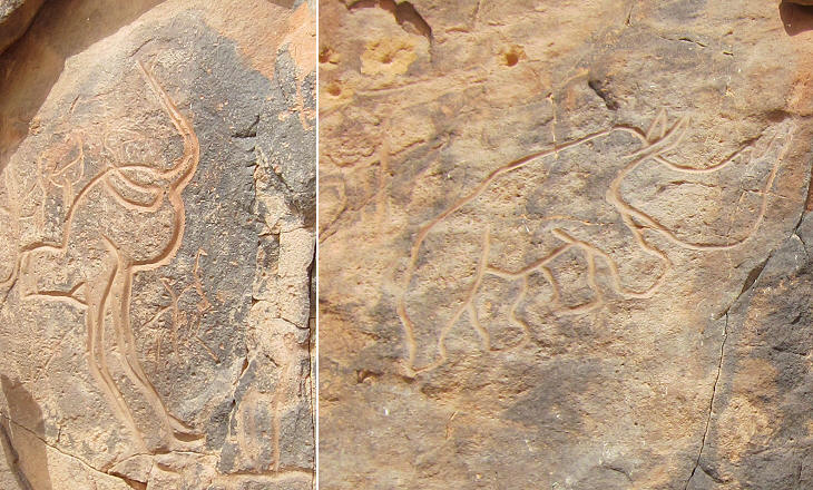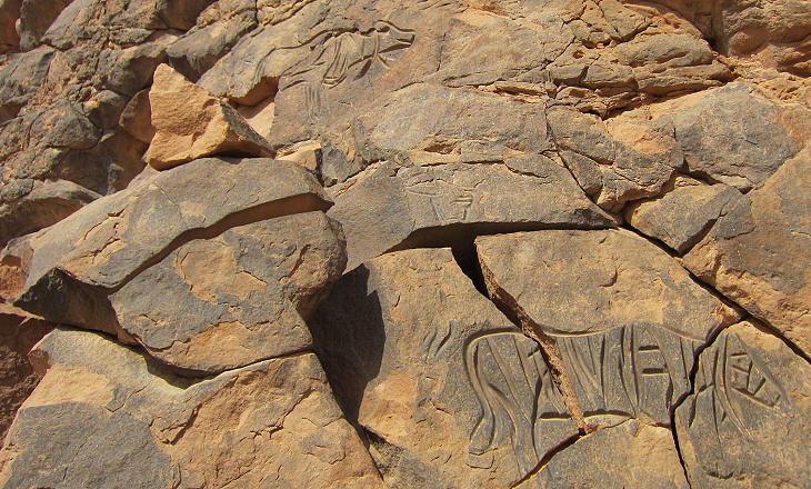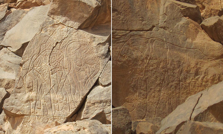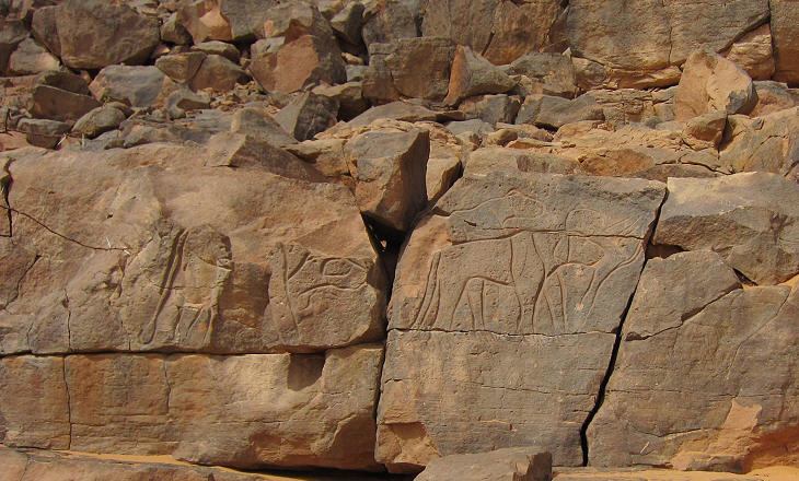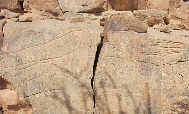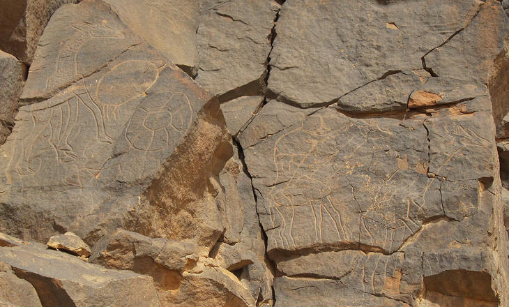 Archaeologists have identified hundreds of carvings along the southern bank of the ancient river; the area of the carvings spans several miles; they were cut by hunters who came to the river to catch, by surprise, animals which were busy drinking; this occurred at the dawn of civilization maybe 12,000 years ago. The purpose of the carvings was most likely a propitiatory one; by representing the animals which made up their main source of food the hunters hoped to attract them to the river.