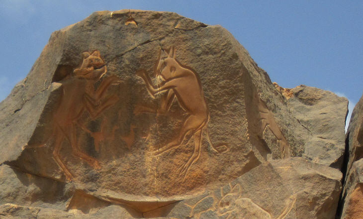 More than one god of the Egyptian pantheon was represented as a cat or had some cat features; the best known carving of Uadi Mathendush portrays two cats; it was cut into a rock at the top of the river bank and because of its size and location it could be easily seen by a small crowd attending ceremonies in the area below; the concept of symmetry is deeply linked with the first development of art and therefore this carving is thought to have been cut later than the other ones and to indicate a step towards civilization. You may wish to see a page on Qobustan, a region of the Republic of Azerbaijan which retains many ancient reliefs which were carved on the rock.